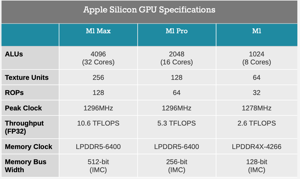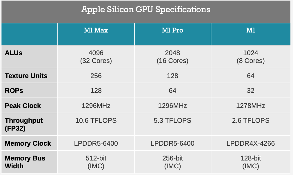 ท้ายที่สุด ทั้งหมดนี้ผลักดันให้ Apple พัฒนาสถาปัตยกรรม GPU ของตนเอง ไม่เพียงแต่จะนำเสนอ SoC ที่สมบูรณ์สำหรับชิ้นส่วนระดับล่างเท่านั้น (M1)แต่ยังทำให้ GPU รวมอยู่ในชิ้นส่วนระดับไฮเอนด์ได้อีกด้วย (M1 Pro และ M1 Max)