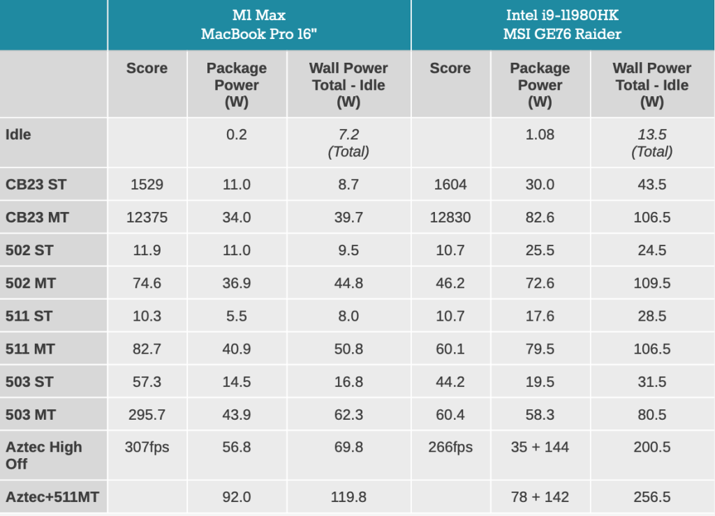 แต่หลังจากที่ อินเทล ได้ออก CPU Gen 12 ในรุ่นเรือธงคือ CPU Core i9-12900K มีผล benchmark เบื้องต้น ว่าสูงกว่าทั้ง M1 Pro และ M1 Max แต่อัตราการใช้พลังงานสูงถึง 125-241W แต่คงต้องรอ intel ผลิตเป็น mobile CPU ก่อนเพื่อเปรียบเทียบกับ M1 Max