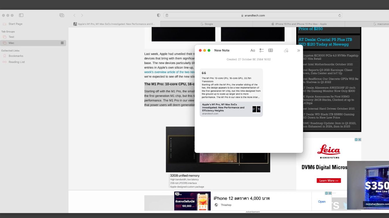 New design MacBook Pro design ตรงกับข่าวลือที่ออกมา Apple Event Occtober ผมว่ามีอะไรว้าวกว่างานเปิดตัว iphone13 อีก แอพเปิ้ลมาปีนี้ เข้าสู่การ transition CPU ของ Intel ไปใช้ Arm Mac silicon ต่อจากปีที่แล้วคือ M1 ที่มี Macbook Air Macbook Pro 13 , Mac mini , iMac ไม่โปร ปีนี้ เอา M1 มาใส่ Macbook รุ่นกลาง MBP14 และ top of the line และ MBP16 แต่ พวกสเปกของ MBP ก็มีคนพูดกันเยอะแล้วว่ามีอะไรเปลี่ยน มาไฮไลต์ของปีนี้คือ เจ้าชิพ Soc M1 Pro และ M1 Max ที่ข่าวออกมาก่อนหน้าจะเรียก M1X M1 คือ ชิพที่แอพเปิ้ลออกแบบเองโดยซื้อสิทธิบัตร Arm processor มาพัฒนาเพื่อใช้กับระบบปฎิบัติการ MacOS ของตัวเอง เป็นการ ออกแแบสถาปัตยกรรมใหม่ของ cpu ไปเป็น SoC หรือ system on chip กล่าวคือ มันถูกรวม CPU GPU ML-AI CPU และ Memory เข้าด้วยกัน โดยทุกๆ หน่วยประมวลผลมีการใช้ หน่วยความจำร่วมกัน ผ่าน Unify Memory pool Apple Soc เลยต้องออกแบบให้มี Memory lane bandwidth ให้สูงมากเพื่อให้ หน่วยประมวลผลเข้าถึงหน่วยความจำได้เร็ว ถ้าเปรียบเทียบกับ PC สถาปัตยกรรม x86 cpu จะมี GPU เล็กๆรวมอยู่ แต่พอใช้งานหนักจะมี CPU แยก มี memory แยกสำหรับทุกหน่วยประมวลผล