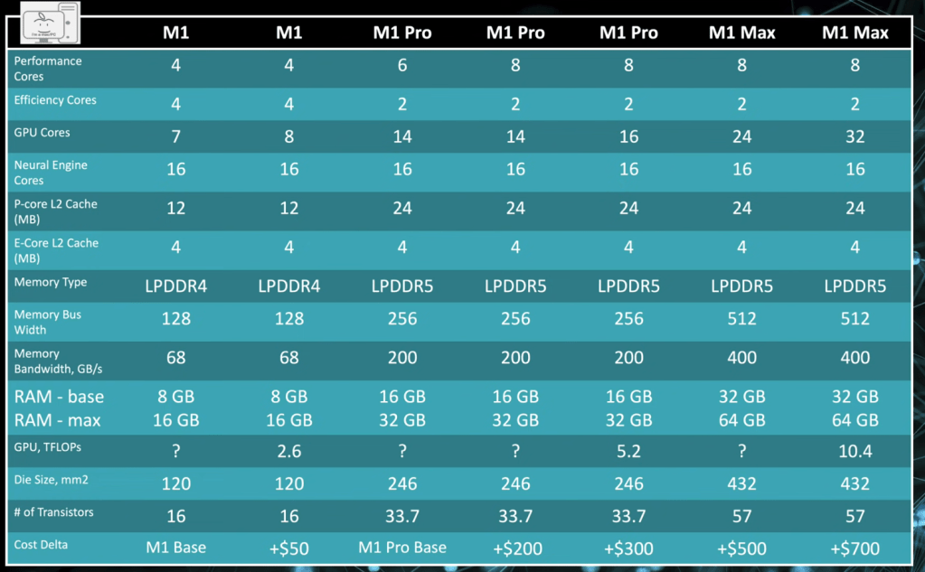 ชิป M1 Pro เป็นชิปที่เล็กกว่ามาก – ประมาณการว่ามีขนาดประมาณ 245 ตรมม. (M1 Max 425 ตรมม) ซึ่ง ทำให้ต้นทุนถูกกว่าในการผลิต ดังนั้นสำหรับ MacBook Pro รุ่นล่างสุด 14 และ 16 นิ้วที่ไม่ต้องการประสิทธิภาพกราฟิกระดับไฮเอนด์ Apple สามารถนำเสนอ GPU ขนาดใหญ่ที่รวมอยู่ในชิ้นส่วนที่เล็กลง ซึ่งยังคงจับคู่กับฮาร์ดแวร์อื่นๆ ทั้งหมดที่สร้าง M1 SoC ล่าสุด โดยรวมแล้วทรงพลังมาก